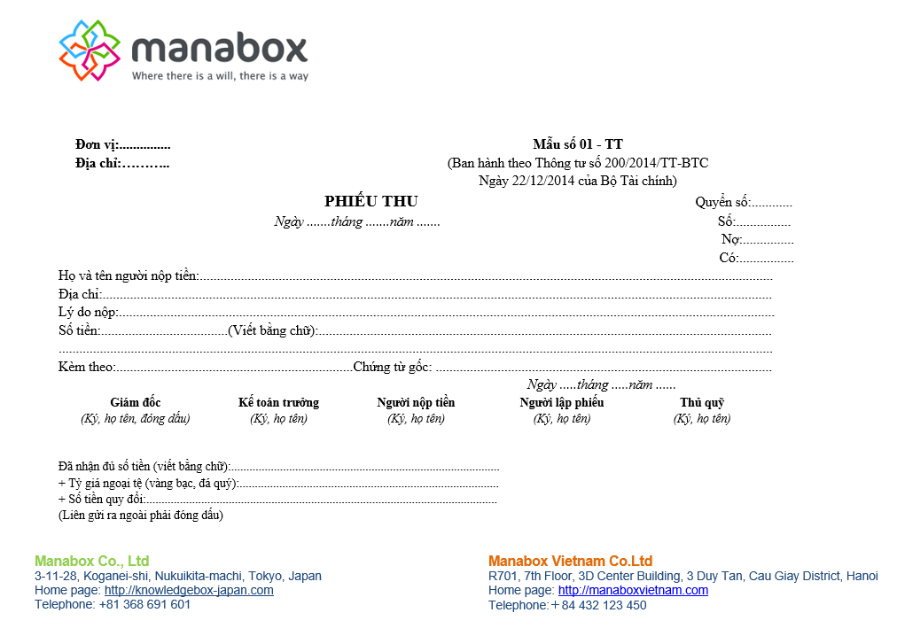 Mẫu Phiếu Thu theo Thông tư 200/2014/TT0BTC, bản tiếng Việt và tiếng Anh, giúp Kế toán xây dựng bộ chứng từ của doanh nghiệp.