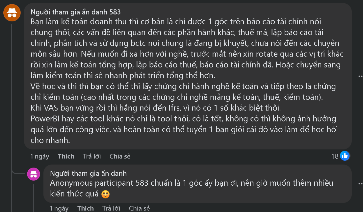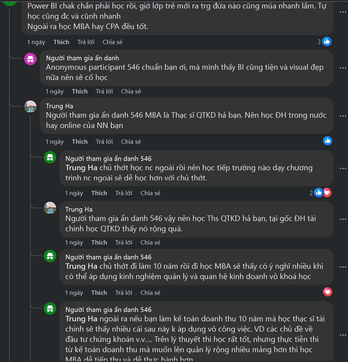 Thành viên ẩn danh chia sẻ: Power BI chak chắn phải học rồi, giờ lớp trẻ mới ra trg đứa nào cũng múa nhanh lắm. Tự học cũng đc và cũnh nhanh Ngoài ra học MBA hay CPA đều tốt.