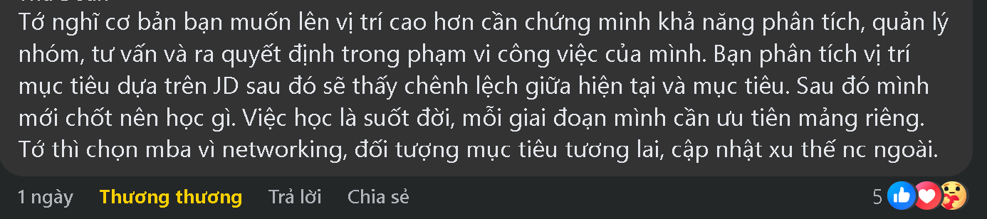 Tớ nghĩ cơ bản bạn muốn lên vị trí cao hơn cần chứng minh khả năng phân tích, quản lý nhóm, tư vấn và ra quyết định trong phạm vi công việc của mình. Bạn phân tích vị trí mục tiêu dựa trên JD sau đó sẽ thấy chênh lệch giữa hiện tại và mục tiêu. Sau đó mình mới chốt nên học gì. Việc học là suốt đời, mỗi giai đoạn mình cần ưu tiên mảng riêng. Tớ thì chọn mba vì networking, đối tượng mục tiêu tương lai, cập nhật xu thế nc ngoài.