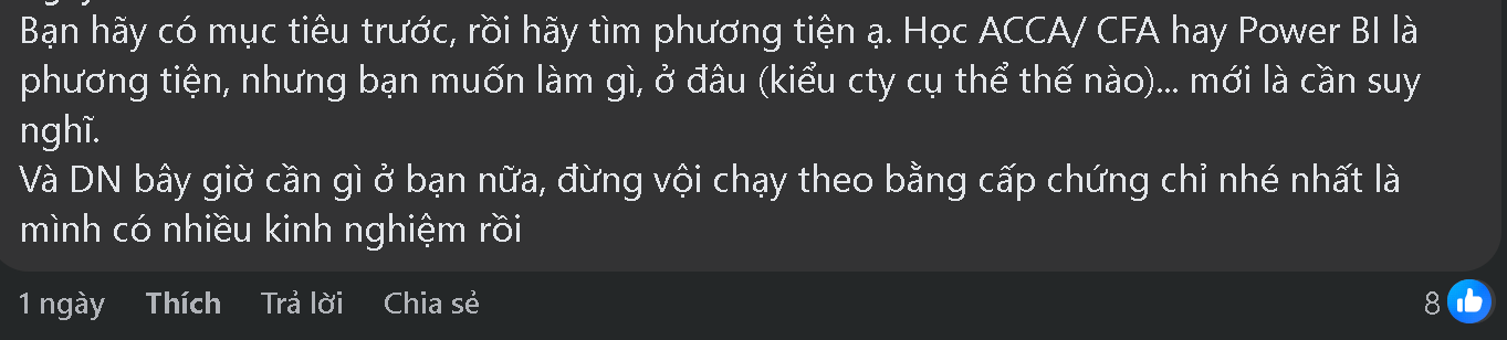 Bạn hãy có mục tiêu trước, rồi hãy tìm phương tiện ạ. Học ACCA/ CFA hay Power BI là phương tiện, nhưng bạn muốn làm gì, ở đâu (kiểu cty cụ thể thế nào)… mới là cần suy nghĩ.