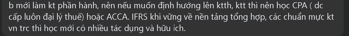 b mới làm kt phần hành, nên nếu muốn định hướng lên ktth, ktt thì nên học CPA ( dc cấp luôn đại lý thuế) hoặc ACCA. IFRS khi vững về nền tảng tổng hợp, các chuẩn mực kt vn trc thì học mới có nhiều tác dụng và hữu ích.
