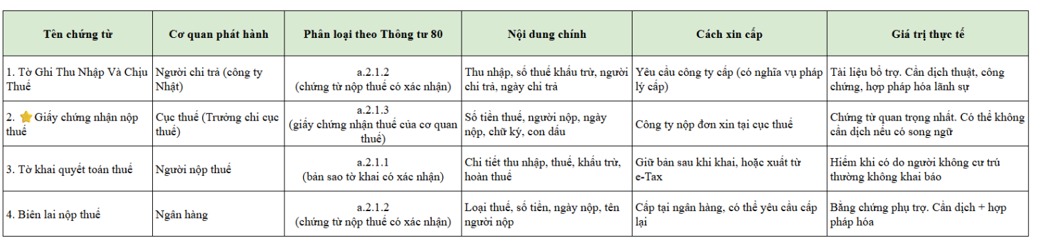 Để giải quyết vấn đề này và tránh tình trạng đánh thuế hai lần, pháp luật Việt Nam cho phép áp dụng cơ chế khấu trừ thuế nước ngoài, căn cứ theo Thông tư 80/2021/TT-BTC (Điều 62, Khoản 3). Tuy nhiên, để được chấp thuận, người nộp thuế cần chuẩn bị đúng loại chứng từ theo yêu cầu của Thông tư – một việc không hề đơn giản nếu không hiểu rõ về hệ thống thuế và giấy tờ tại Nhật Bản.