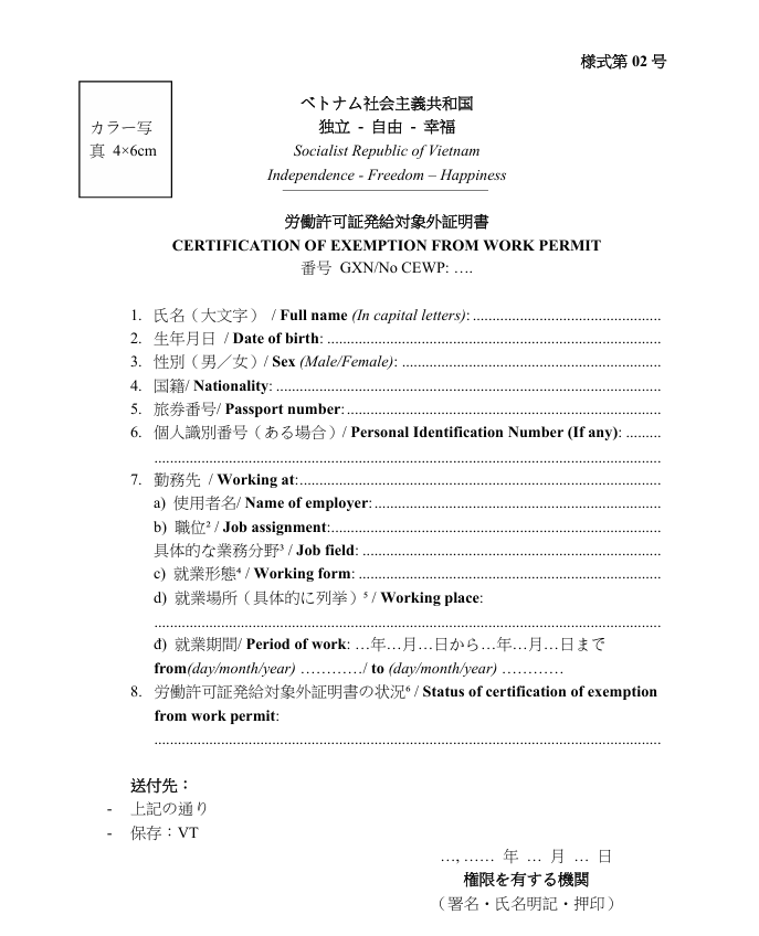 Mẫu số 02 – Giấy xác nhận không thuộc diện GPLĐ
