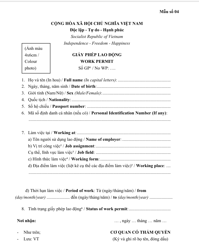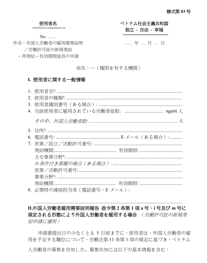 Mẫu này thể hiện lý do và nhu cầu sử dụng NLĐ nước ngoài, kèm đề nghị cấp GPLĐ. Đây là bước bắt buộc trước khi tuyển dụng lao động nước ngoài.