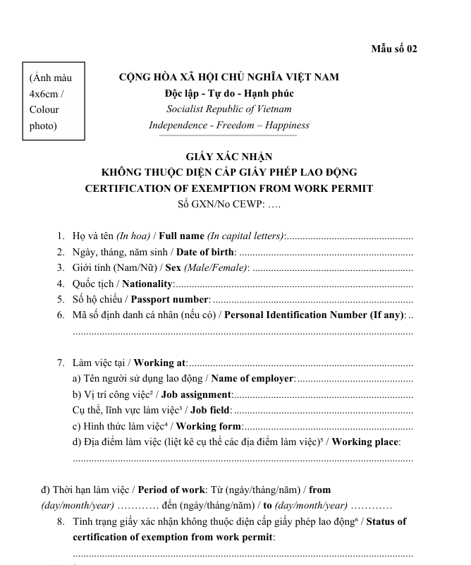 Mẫu số 02 – Giấy xác nhận không thuộc diện GPLĐ
