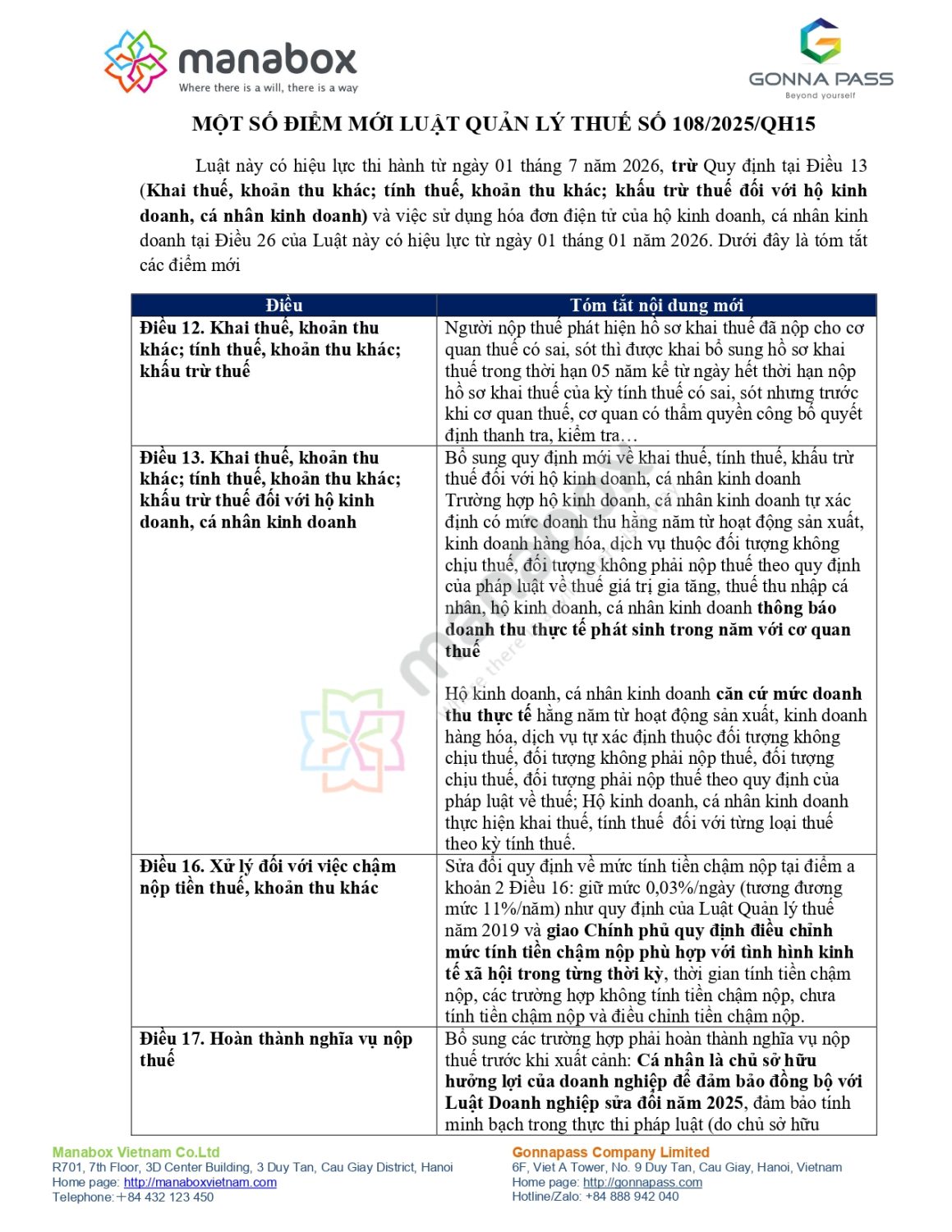 Luật này có hiệu lực thi hành từ ngày 01 tháng 7 năm 2026, trừ Quy định tại Điều 13 (Khai thuế, khoản thu khác; tính thuế, khoản thu khác; khấu trừ thuế đối với hộ kinh doanh, cá nhân kinh doanh) và việc sử dụng hóa đơn điện tử của hộ kinh doanh, cá nhân kinh doanh tại Điều 26 của Luật này có hiệu lực từ ngày 01 tháng 01 năm 2026. Dưới đây là tóm tắt các điểm mới