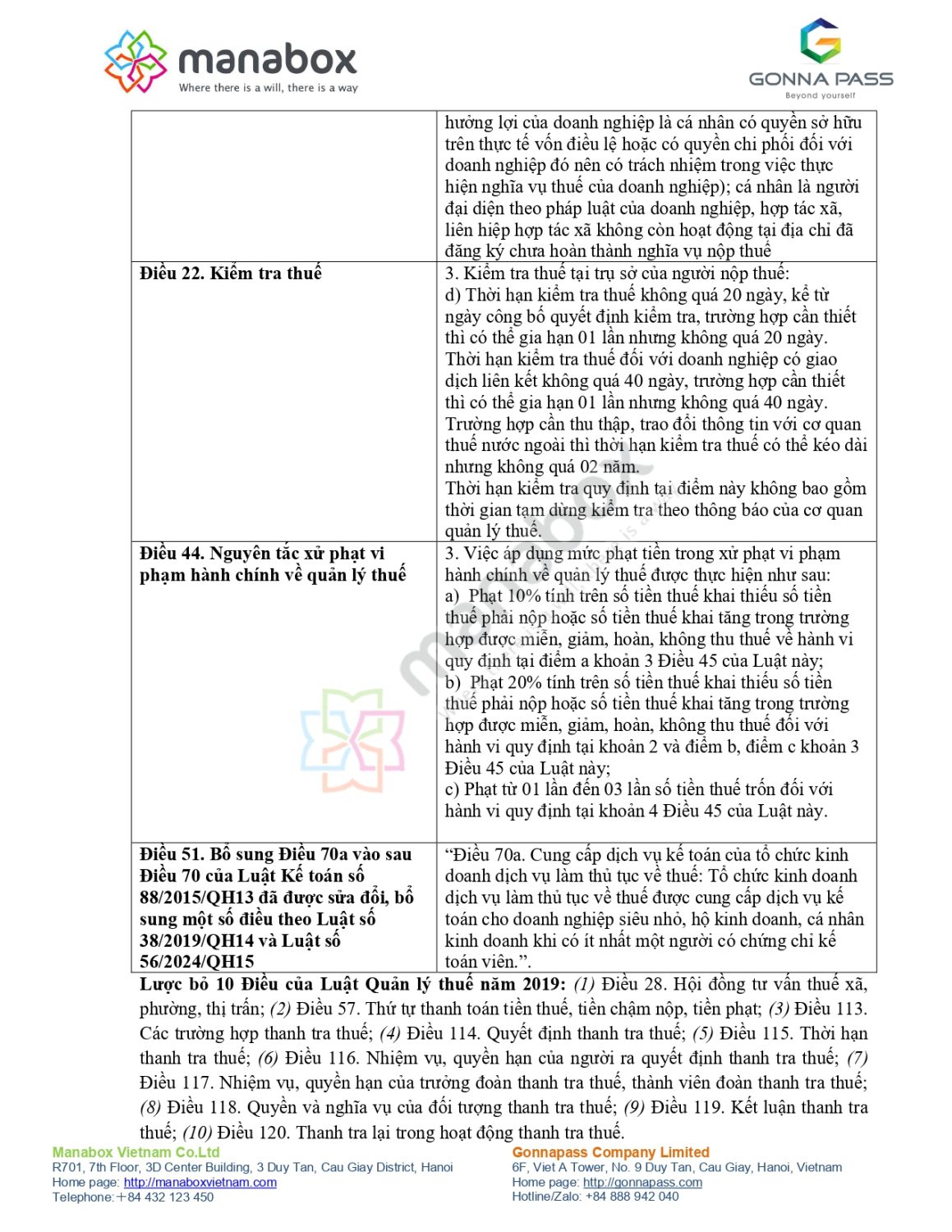 Lược bỏ 10 Điều của Luật Quản lý thuế năm 2019: (1) Điều 28. Hội đồng tư vấn thuế xã, phường, thị trấn; (2) Điều 57. Thứ tự thanh toán tiền thuế, tiền chậm nộp, tiền phạt; (3) Điều 113. Các trường hợp thanh tra thuế; (4) Điều 114. Quyết định thanh tra thuế; (5) Điều 115. Thời hạn thanh tra thuế; (6) Điều 116. Nhiệm vụ, quyền hạn của người ra quyết định thanh tra thuế; (7) Điều 117. Nhiệm vụ, quyền hạn của trưởng đoàn thanh tra thuế, thành viên đoàn thanh tra thuế; (8) Điều 118. Quyền và nghĩa vụ của đối tượng thanh tra thuế; (9) Điều 119. Kết luận thanh tra thuế; (10) Điều 120. Thanh tra lại trong hoạt động thanh tra thuế.