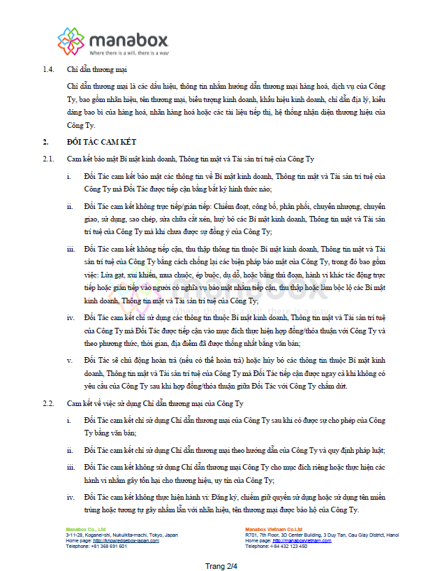 Cam Kết Bảo Mật Thông Tin Và Chống Cạnh Tranh (Sau đây gọi là “Cam kết”) này được lập và có hiệu lực vào ngày __ tháng __ năm 20____ bởi cá nhân có thông tin nêu tại phần ký của Cam kết (Sau đây gọi tắt là “Đối Tác”) và CÔNG TY TNHH MANABOX VIỆT NAM ; Mã số thuế: 0106785090; Địa chỉ: Phòng 701, tầng 7,tòa nhà 3D center số 3 Duy Tân, phường Dịch Vọng Hậu, quận Cầu Giấy, thành phố Hà Nội, Việt Nam; Đại diện bởi: Ông SUGENO TOMOHIRO (Sau đây gọi tắt là “Công Ty”)
