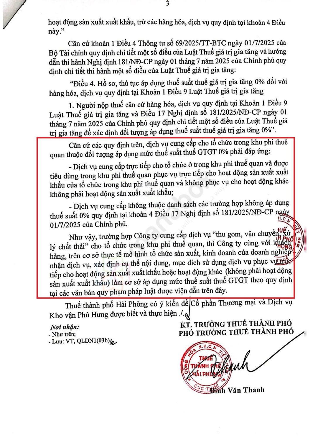 - 2. Cần làm việc với khách hàng, xác định cụ thể nội dung và mục đích sử dụng dịch vụ, xác định rõ mục đích sử dụng dịch vụ là phục vụ trực tiếp cho hoạt động sản xuất xuất khẩu. Theo quy định tại Điều 4 Thông tư số 69/2025/TT-BTC và Điều 17 Nghị định 181/2025/NĐ-CP, dịch vụ cung cấp vào KPTQ được áp dụng thuế suất 0% phải là dịch vụ cung cấp trực tiếp cho tổ chức trong KPTQ, được tiêu dùng trong KPTQ, phục vụ trực tiếp cho hoạt động sản xuất xuất khẩu và không phục vụ cho hoạt động khác.