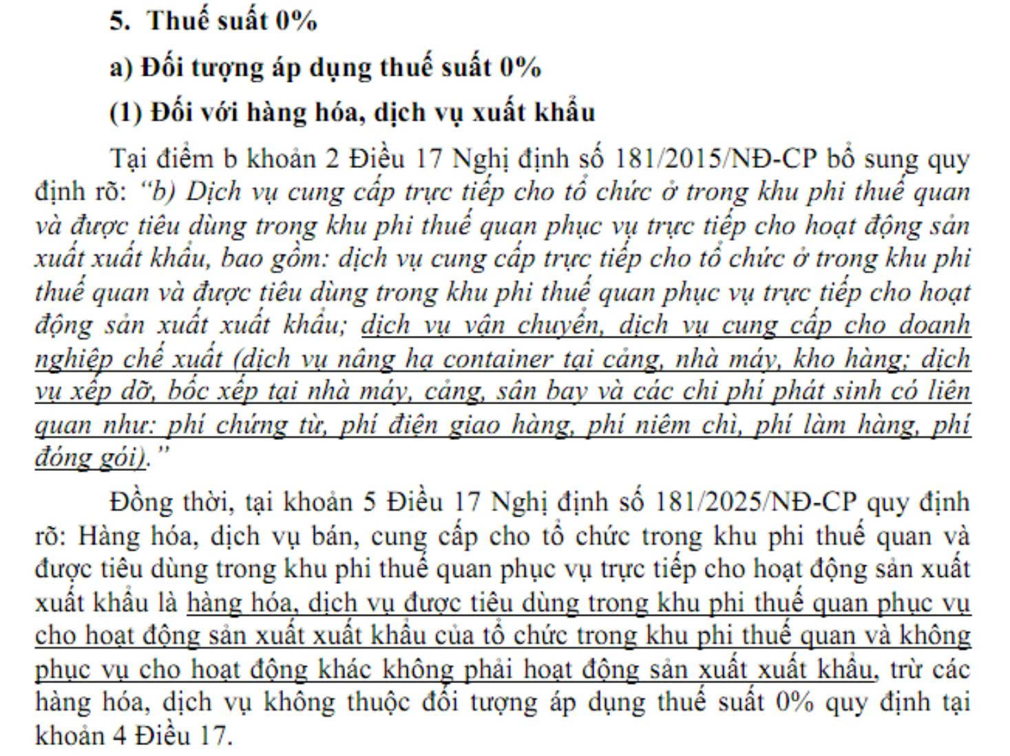 - Từ ngày 01/7/2025, Luật Thuế GTGT 2024 (có hiệu lực 1/7/2025) cùng Nghị định 181/2025/NĐ-CP và Thông tư 69/2025/TT-BTC quy định “2. Dịch vụ xuất khẩu bao gồm:….b) Dịch vụ cung cấp trực tiếp cho tổ chức ở trong khu phi thuế quan và được tiêu dùng trong khu phi thuế quan phục vụ trực tiếp cho hoạt động sản xuất xuất khẩu, bao gồm: dịch vụ cung cấp trực tiếp cho tổ chức ở trong khu phi thuế quan và được tiêu dùng trong khu phi thuế quan phục vụ trực tiếp cho hoạt động sản xuất xuất khẩu; dịch vụ vận chuyển, dịch vụ cung cấp cho doanh nghiệp chế xuất (dịch vụ nâng hạ container tại cảng, nhà máy, kho hàng; dịch vụ xếp dỡ, bốc xếp tại nhà máy, cảng, sân bay và các chi phí phát sinh có liên quan như: phí chứng từ, phí điện giao hàng, phí niêm chì, phí làm hàng, phí đóng gói)…”