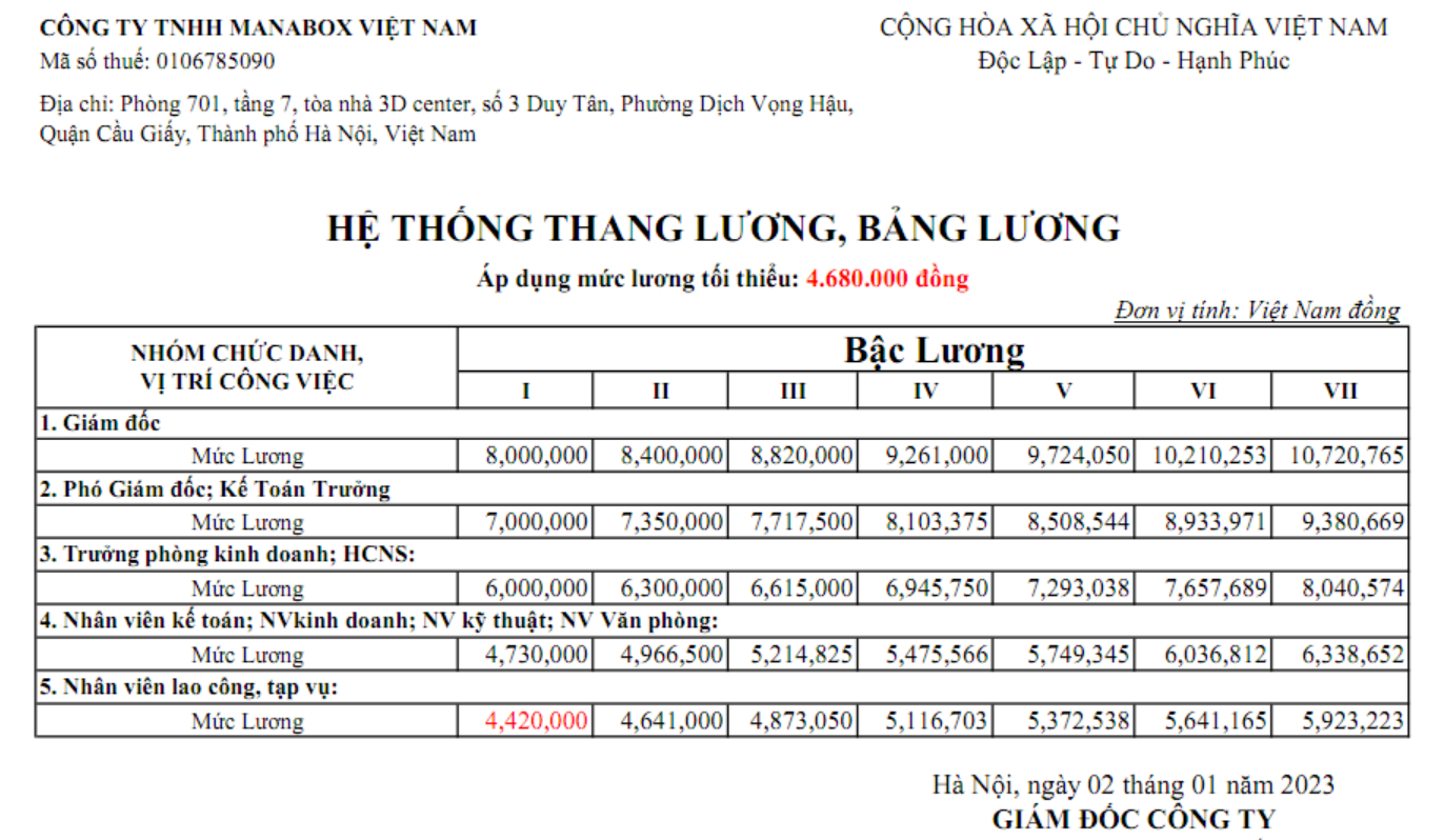 Từ ngày 1/1/2021, theo điều 93 Luật Lao động 2019, công ty không bắt buộc phải nộp lên Phòng Lao động – Thương binh và Xã hội để đăng ký thang bảng lương nhưng cần thực hiện xây dựng và ban hành thang bảng lương trong công ty. Đồng thời, công ty có thể tự quyết định khoảng cách giữa hai bậc lương liền kề mà không bị bắt buộc tối thiếu là 5%