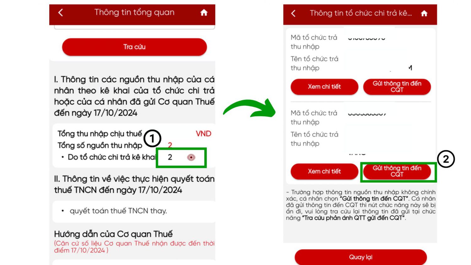 - Tại màn hình “Thông tin tổng quan”, hiển thị Tổng thu nhập chịu thuế của năm và Số nguồn thu nhập. Bấm chọn vào vị trí đánh dấu [1] để xem chi tiết