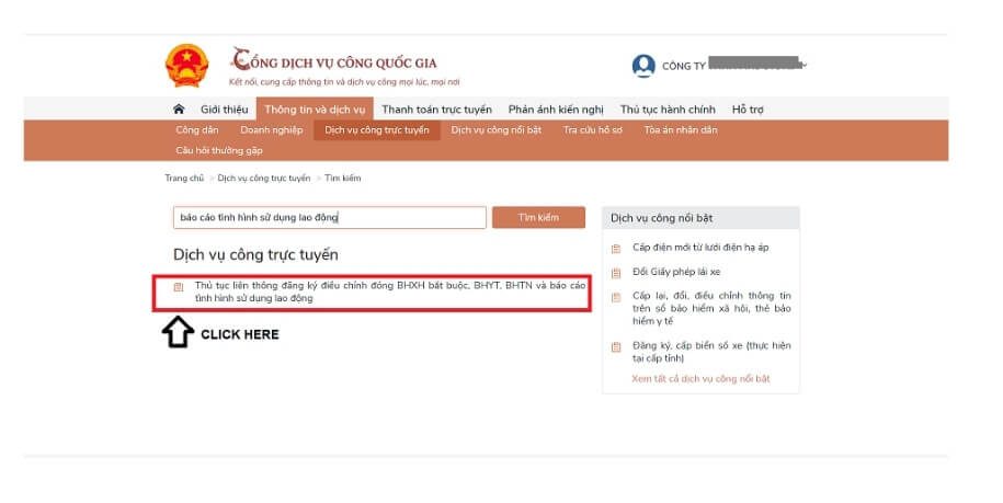 Bước 2: Tìm kiếm và Chọn “Thủ tục liên thông đăng ký điều chỉnh đóng BHXH bắt buộc, BHYT, BHTN và báo cáo tình hình sử dụng lao động”.