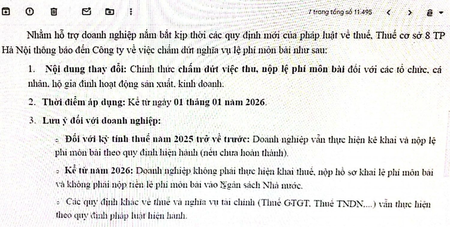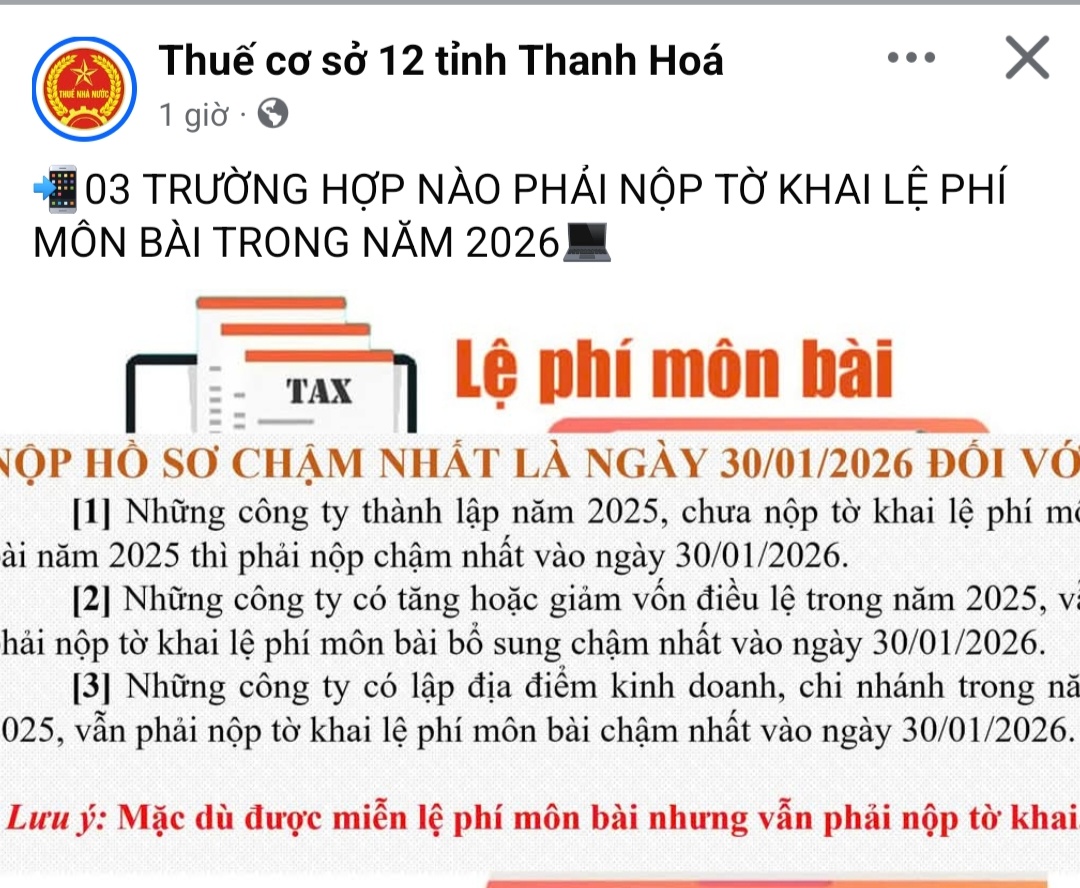 “Chấm dứt việc thu, nộp lệ phí môn bài từ ngày 01 tháng 01 năm 2026.”