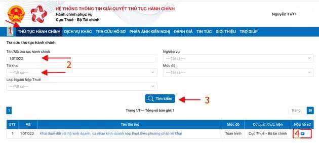 – Tại ô tìm kiếm, nhập mã thủ tục hành chính hoặc tên tờ khai thuế bạn cần lập → bấm “Tìm kiếm”.