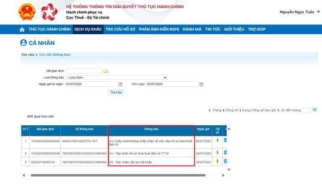 – Sau nộp thành công, bạn vào “Dịch vụ khác” → “Tra cứu” → “Tra cứu thông báo” để xem kết quả gửi tờ khai.