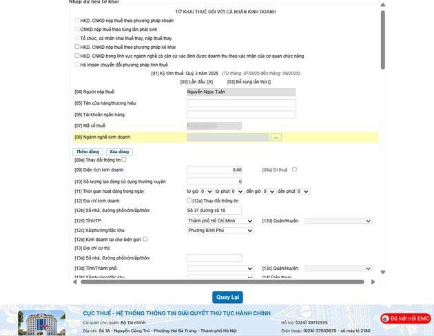 – Sau khi điền xong, nhấn “Tiếp tục” để vào phần nội dung khai thuế thực tế.