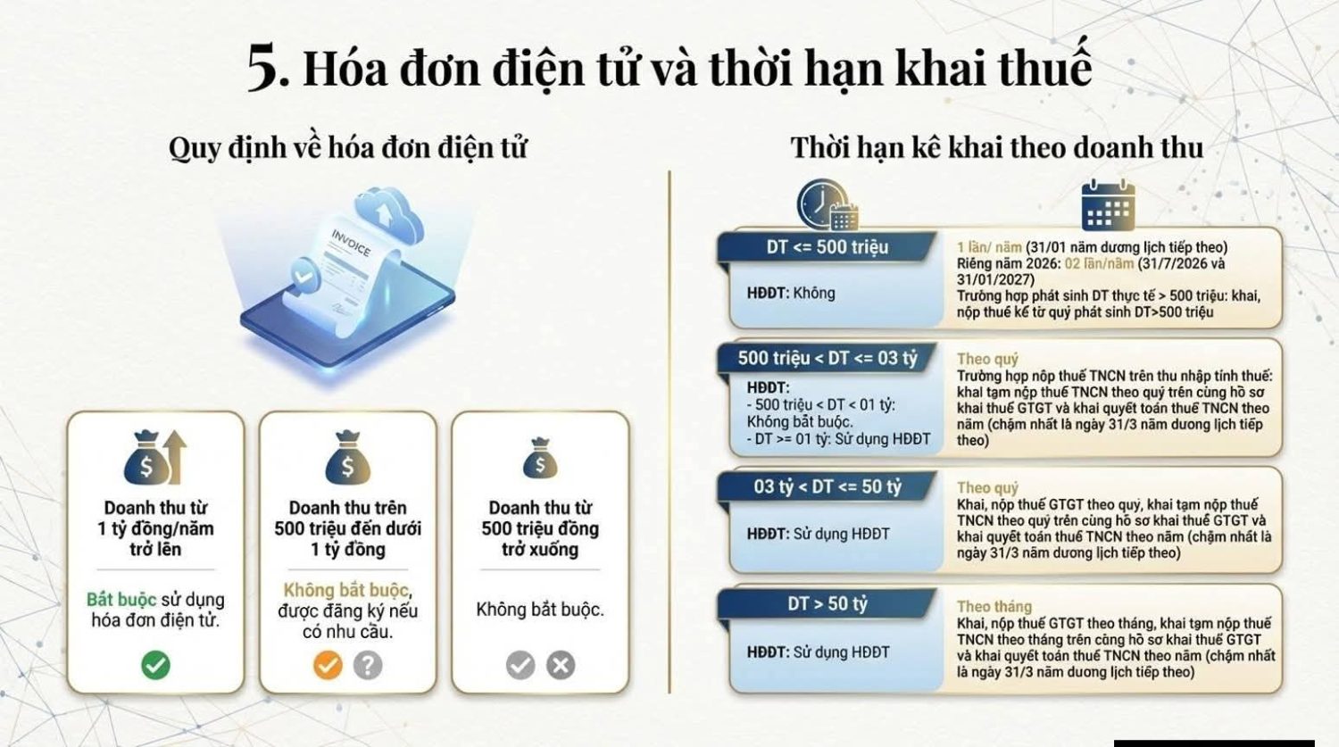 Khai LPMB, khai GTGT & TNCN theo quý/từng lần phát sinh, nộp tờ khai và tiền thuế qua eTax/eTax Mobile; thời hạn tuân thủ.