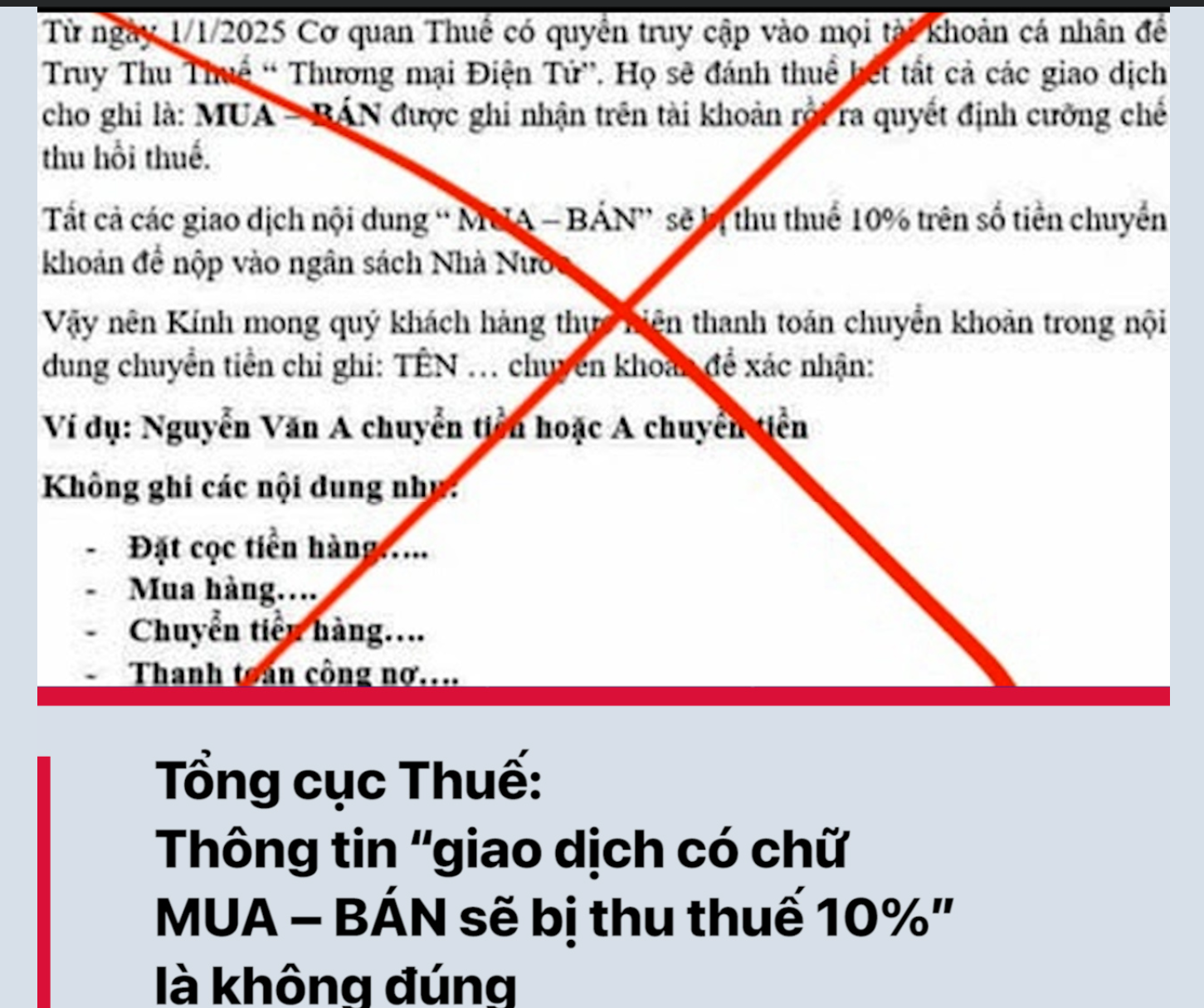 Trong thời gian gần đây, mạng xã hội lan truyền một thông báo sai sự thật rằng từ ngày 1/1/2025, cơ quan thuế sẽ áp thuế 10% đối với tất cả giao dịch thương mại điện tử, bao gồm các giao dịch chuyển khoản có ghi nội dung “mua – bán”. Thông tin này đã gây hoang mang cho nhiều cá nhân và doanh nghiệp kinh doanh online. Theo thông báo lan truyền trên mạng xã hội, cơ quan thuế được cho là sẽ “truy cập vào mọi tài khoản cá nhân để truy thu thuế giao dịch thương mại điện tử”. Nội dung thông báo còn yêu cầu người mua khi chuyển khoản chỉ được ghi tên người chuyển, và cấm ghi các nội dung như “đặt cọc tiền hàng”, “mua hàng”, hay “thanh toán công nợ”.