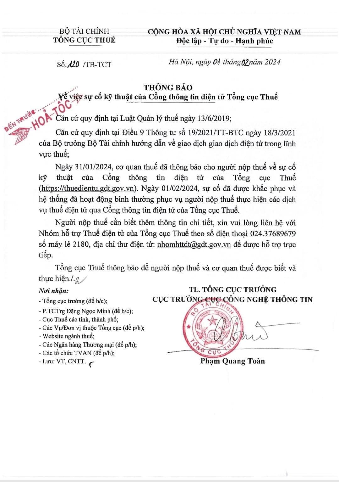 THÔNG BÁO CỦA CỤC THUẾ VỀ VIỆC TẠM DỪNG CÁC HỆ THỐNG THUẾ ĐIỆN TỬ PHỤC VỤ NÂNG CẤP ĐÁP ỨNG TÁI CƠ CẤU, SẮP XẾP CƠ QUAN THUẾ