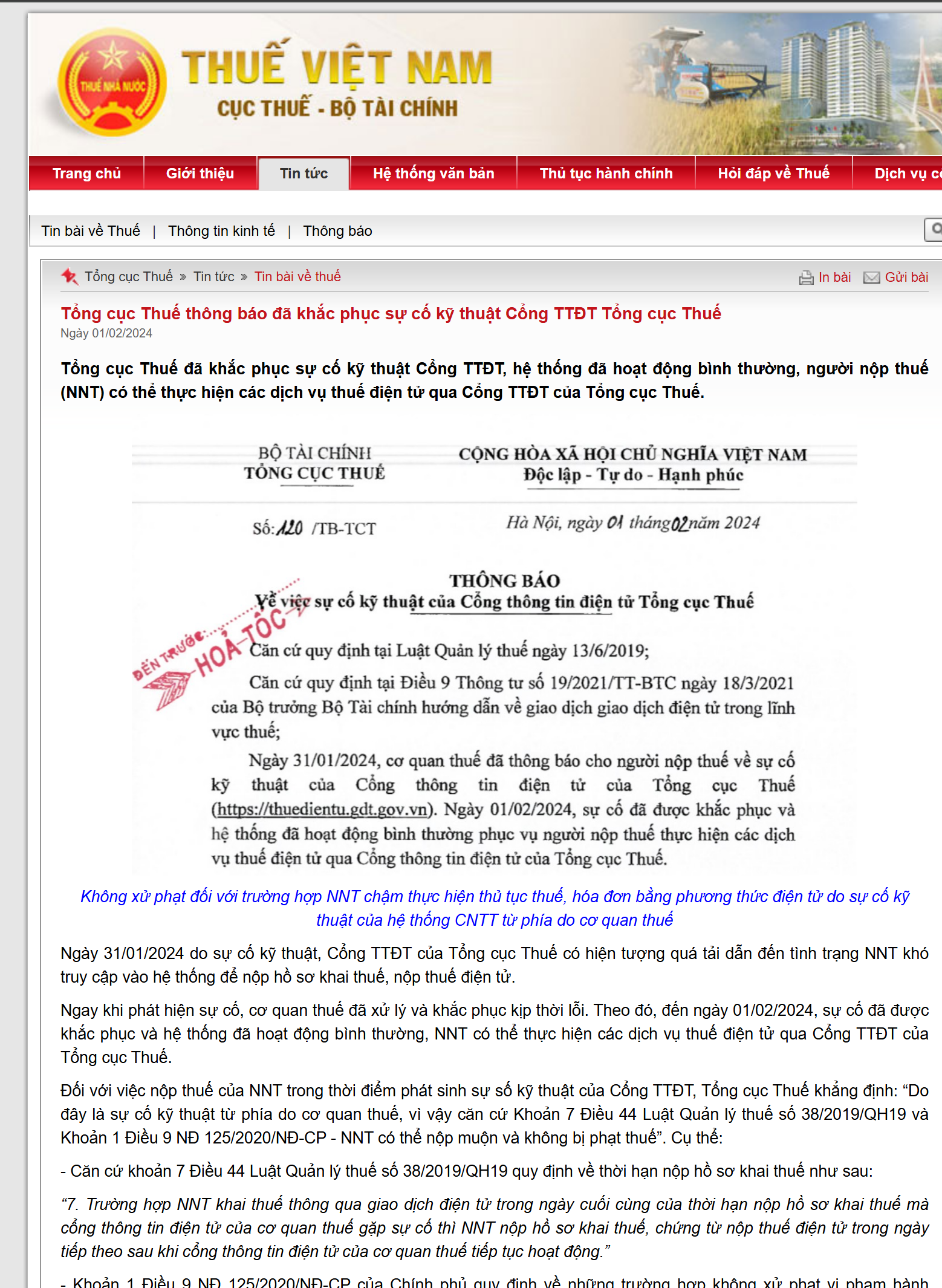 Trước đó, ngày 31/01/2024, do sự cố kỹ thuật, Cổng TTĐT của Tổng cục Thuế bị quá tải, khiến NNT gặp khó khăn khi nộp hồ sơ khai thuế và thuế điện tử. Tuy nhiên, cơ quan thuế đã khắc phục sự cố và đến 01/02/2024, hệ thống hoạt động bình thường. Vậy Chậm nộp hồ sơ do lỗi hệ thống thuế thì xử lý như thế nào?