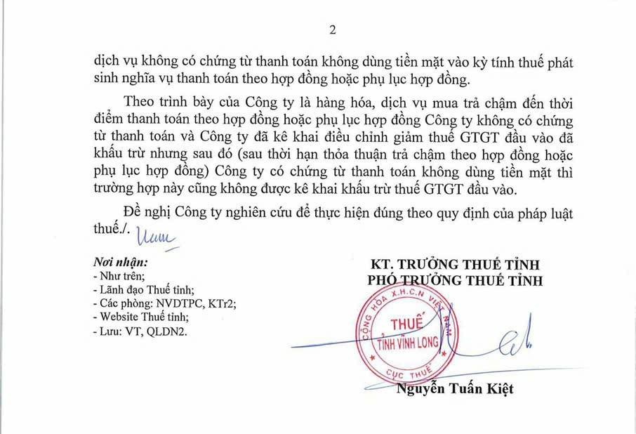 - Một số công văn ghi nhận hướng xử lý (ví dụ Cục Thuế Vĩnh Long): nếu đến hạn mà chưa có chứng từ thanh toán không dùng tiền mặt thì coi như không được khấu trừ đầu vào, kể cả sau này mới thanh toán.