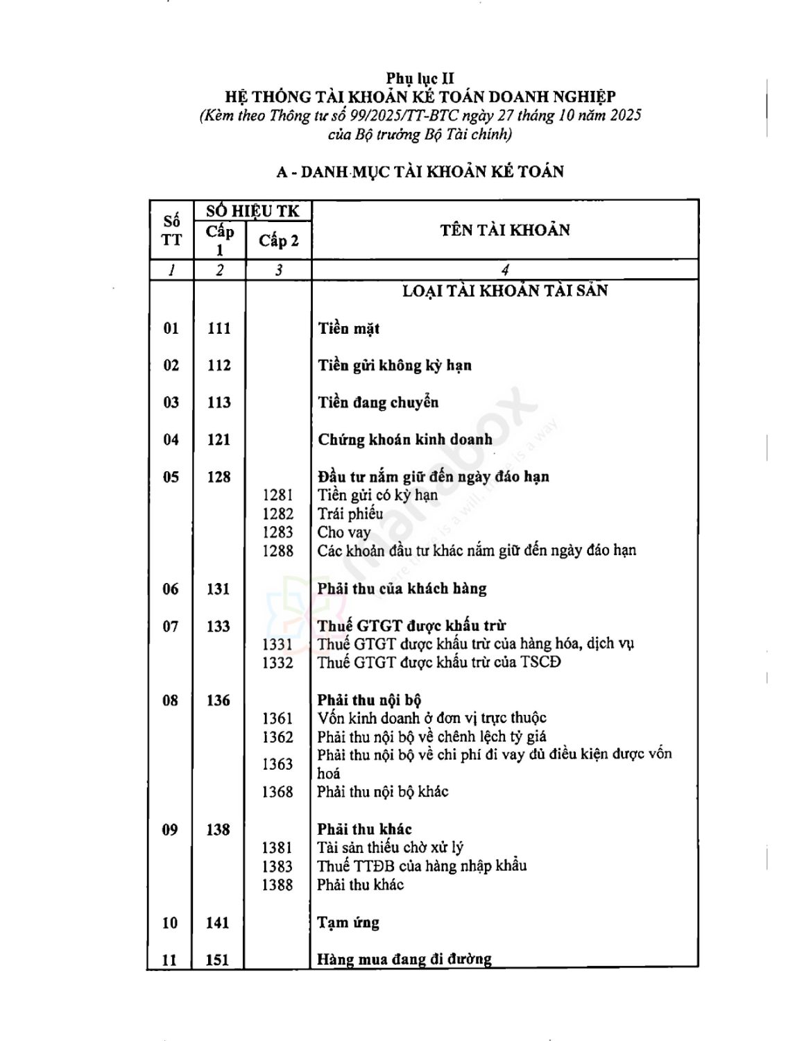 ➕ THÊM: TK 215 (Tài sản sinh học) được bổ sung, cùng với các TK chi tiết cấp 2/3 (2151, 2152, 2153…) 6. – BỔ SUNG CẤP 2: TK 229 (Dự phòng) có thêm 2295 (Dự phòng tổn thất tài sản sinh học) 7. – THAY ĐỔI CẤP 2/3: TK 241 (XDCB dở dang) chi tiết hơn về sửa chữa: TT 99 có 2413 (“Sửa chữa, bảo dưỡng định kỳ”) và 2414 (“Nâng cấp, cải tạo”) thay cho 2413 (“Sửa chữa lớn TSCĐ”) của TT 20088. |