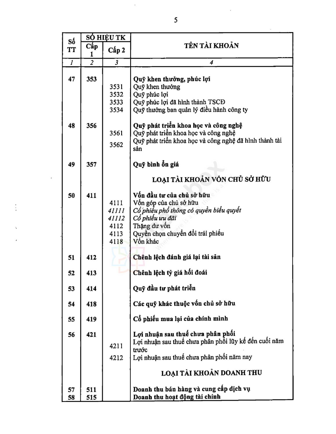 | 4 | 411, 412, 413, 414, 418, 419, 421 | Vốn chủ sở hữu |
