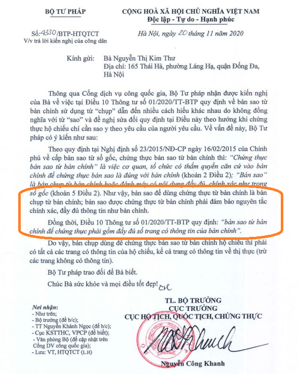 Công văn số 4330/BTP-HTQTCT trả lời công dân của Bộ Tư pháp trích dẫn văn bản quy phạm pháp có nêu: “bản sao được chứng thực tư bản chính phải đảm bảo nguyên tắc chính xác, đầy đủ thông tin như bản chính”.