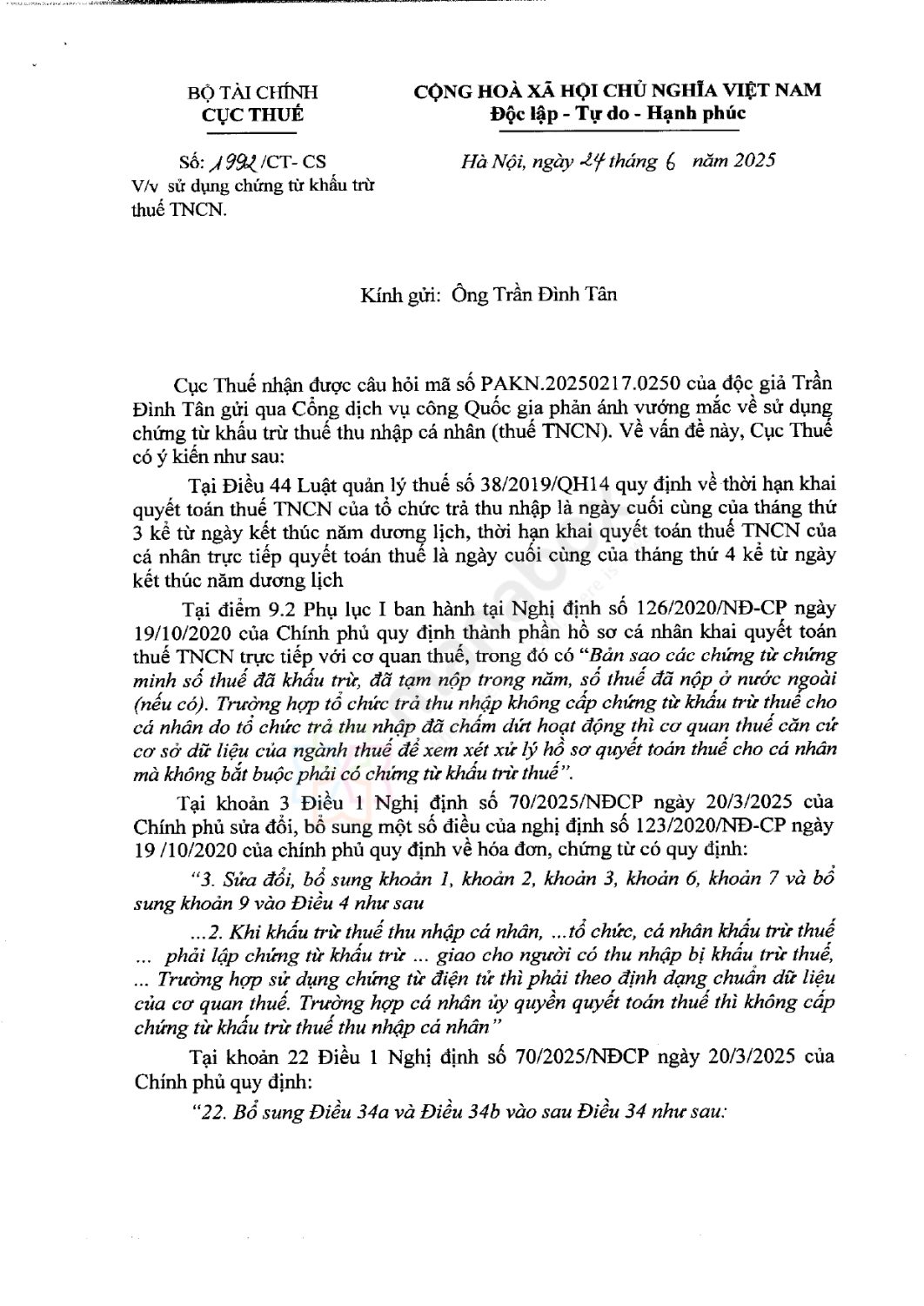 Theo quy định thì thời hạn quyết toán thuế TNCN tiền lương tiền công của cá nhân kết thúc sau thời hạn quyết toán thuế của tổ chức trả thu nhập. Một số trường hợp sau khi kết thúc năm dương lịch cá nhân đã thực hiện quyết toán thuế, trước khi tổ chức trả thu nhập quyết toán thuế TNCN thì hệ thống ngành thuế chưa có đầy đủ thông tin thu nhập, và số thuế TNCN đã khấu trừ của cá nhân. Khi đó chứng từ khấu trừ thuế TNCN là căn cứ để cá nhân thực hiện quyết toán thuế TNCN và là cơ sở để cơ quan thuế đối soát với thông tin kê khai trên hồ sơ khai thuế.