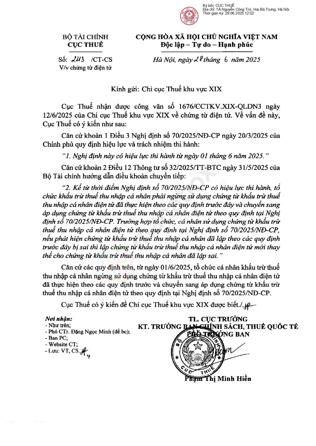 Theo công văn số 2113/CT-CS, áp dụng thông tư 32/2025/TT-BTC quy định cụ thể việc bắt buộc áp dụng từ 1/6/2025, về cơ bản mục tiêu là để phù hợp với quy định về chứng từ điện tử, cơ quan thuế kiểm soát việc doanh nghiệp đã khấu trừ thuế của người lao động và phải gửi dữ liệu cho cơ quan thuế, tránh trường hợp doanh nghiệp trừ tiền thuế của người lao động nhưng không nộp về Nhà nước.