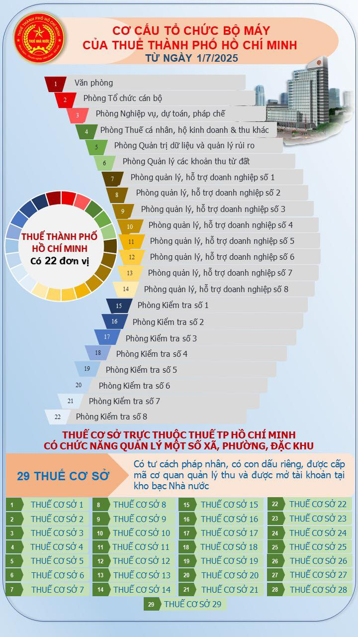 Cơ cấu tổ chức và quản lý Cục thuế TP Hồ Chí Minh từ ngày 1/7/2025, Cục Thuế TP.HCM vận hành theo mô hình gồm 22 phòng/đơn vị cấp Cục và hệ thống 29 “Thuế cơ sở” (đơn vị trực thuộc) chịu trách nhiệm quản lý người nộp thuế theo địa bàn xã/phường/đặc khu. Bài viết dưới đây tóm lược cơ cấu tổ chức và đối chiếu từng Thuế cơ sở với các phường/xã được phân quản.