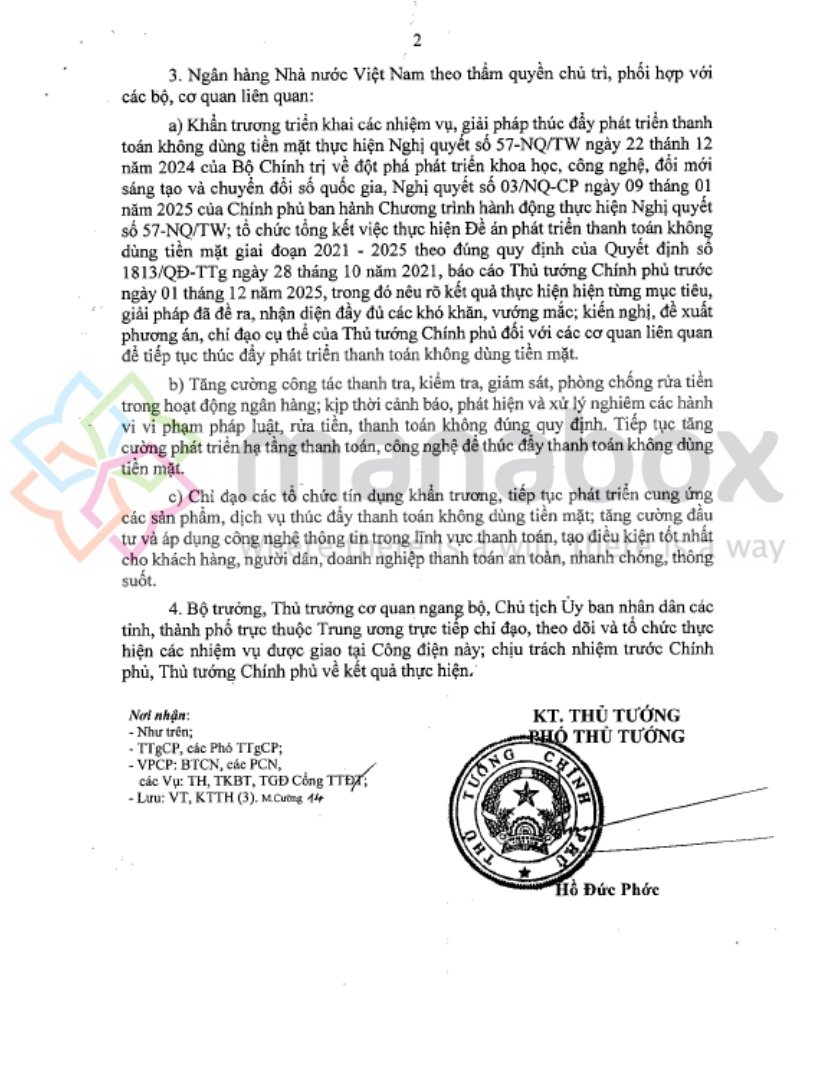 Về nội dung công điện đã trình bày rõ trong thời gian qua, Chính phủ, Thủ tướng Chính phủ đã có nhiều chỉ đạo quyết liệt, kịp thời, hiệu quả đối với Ngân hàng Nhà nước Việt Nam, các cơ quan liên quan, các tổ chức tín dụng về thúc đẩy thanh toán không dùng tiền mặt, trong đó có Quyết định số 1813/QĐ-TTg ngày 28/10/2021 của Thủ tướng Chính phủ về việc phê duyệt Đề án phát triển thanh toán không dùng tiền mặt giai đoạn 2021 – 2025.