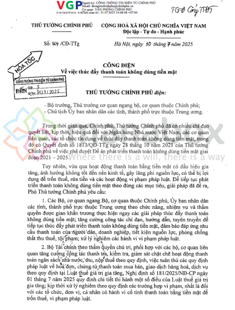 Thời gian gần đây, sau khi các luật mới liên quan đến thuế có hiệu lực từ 01/07/2025, đã xuất hiện nhiều trường hợp cố tình thanh toán bằng tiền mặt để trốn thuế. Bởi vậy, Phó Thủ tướng Chính phủ Hồ Đức Phớc đã ký Công điện số 124/CĐ-TTg ngày 30/7/2025 của Thủ tướng Chính phủ gửi các bộ ngành, địa phương về việc thúc đẩy thanh toán không dùng tiền mặt, hướng tới xử lý nghiêm các trường hợp cố tình thanh toán bằng tiền mặt để trốn thuế.