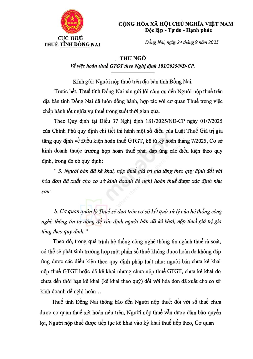 Nghị định 181/2025/NĐ-CP đề cập thêm đoạn điều kiện hoàn thuế như sau: Người bán đã kê khai, nộp thuế giá trị gia tăng theo quy định đối với hóa đơn đã xuất cho cơ sở kinh doanh đề nghị hoàn thuế được xác định như sau: