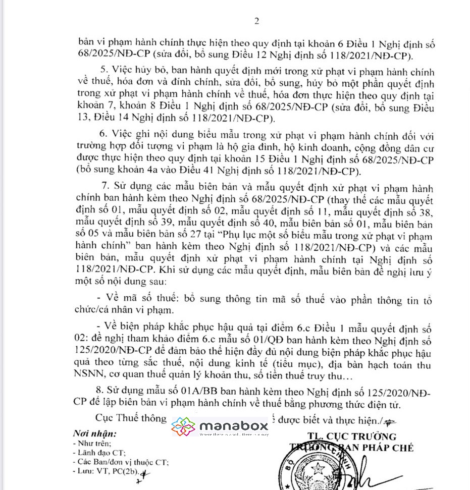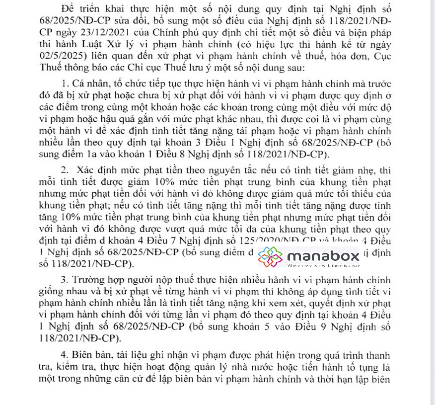 | Vi phạm xảy ra trước 02/05/2025 (ngày NĐ 68/2025 có hiệu lực) | Nguyên tắc áp dụng quy định có lợi | Áp dụng quy định có lợi cho người vi phạm khi xem xét quyết định xử phạt | Nêu rõ trong phần hướng dẫn của công văn |