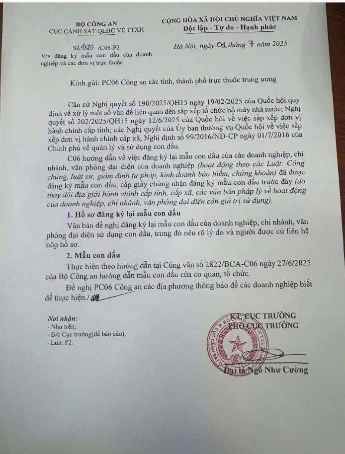 Bộ Công an – Cục Cảnh sát Quản lý Hành chính về trật tự xã hội (C06) ban hành văn bản số 4379/C06-P2 ngày 01/07/2025 nội dung hướng dẫn việc đăng ký lại mẫu dấu của các doanh nghiệp, chi nhánh, văn phòng đại diện, do có thay đổi địa giới hành chính cấp tỉnh, cấp xã theo các Nghị quyết của Quốc hội.