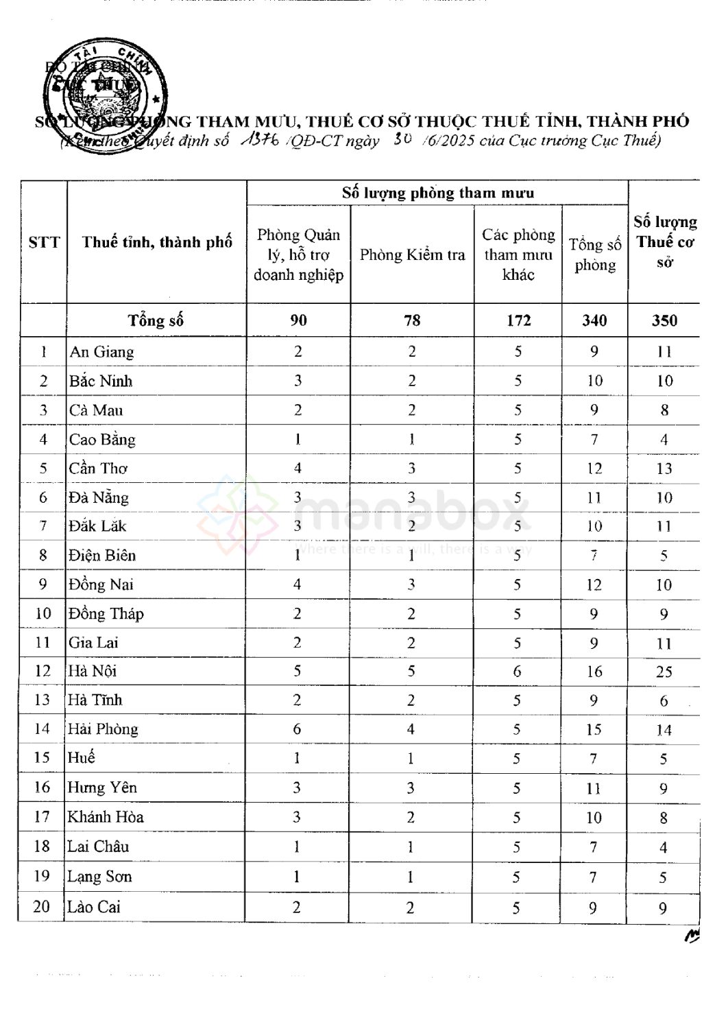 Ngày 30/6/2025, Cục Thuế ban hành Quyết định 1376/QĐ-BTC quy định về chức năng, nhiệm vụ, quyền hạn và cơ cấu tổ chức của Thuế tỉnh thành phố thuộc Cục Thuế, trong đó có danh sách 34 Thuế tỉnh thành phố từ 01/7/2025. Dưới đây là Danh sách 34 Chi cục thuế khu vực mới nhất