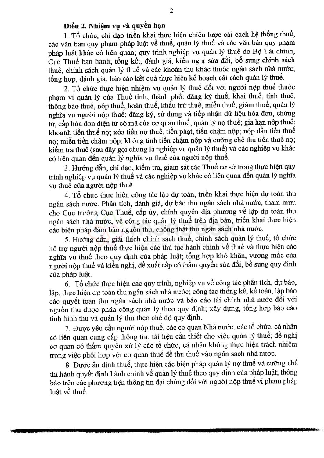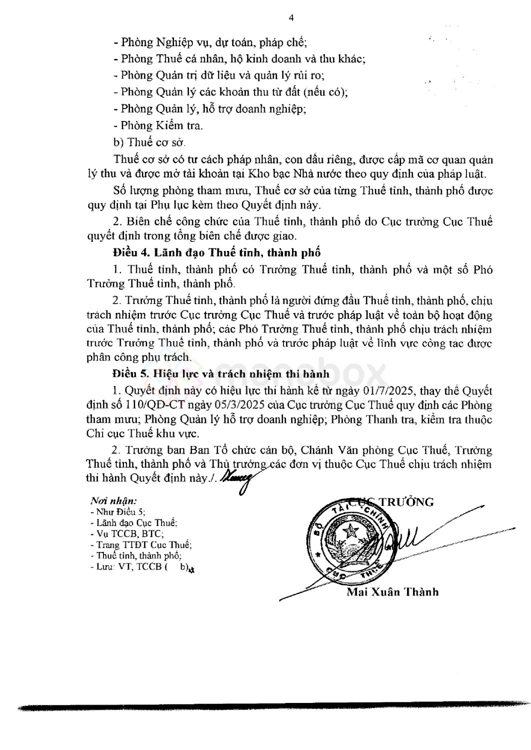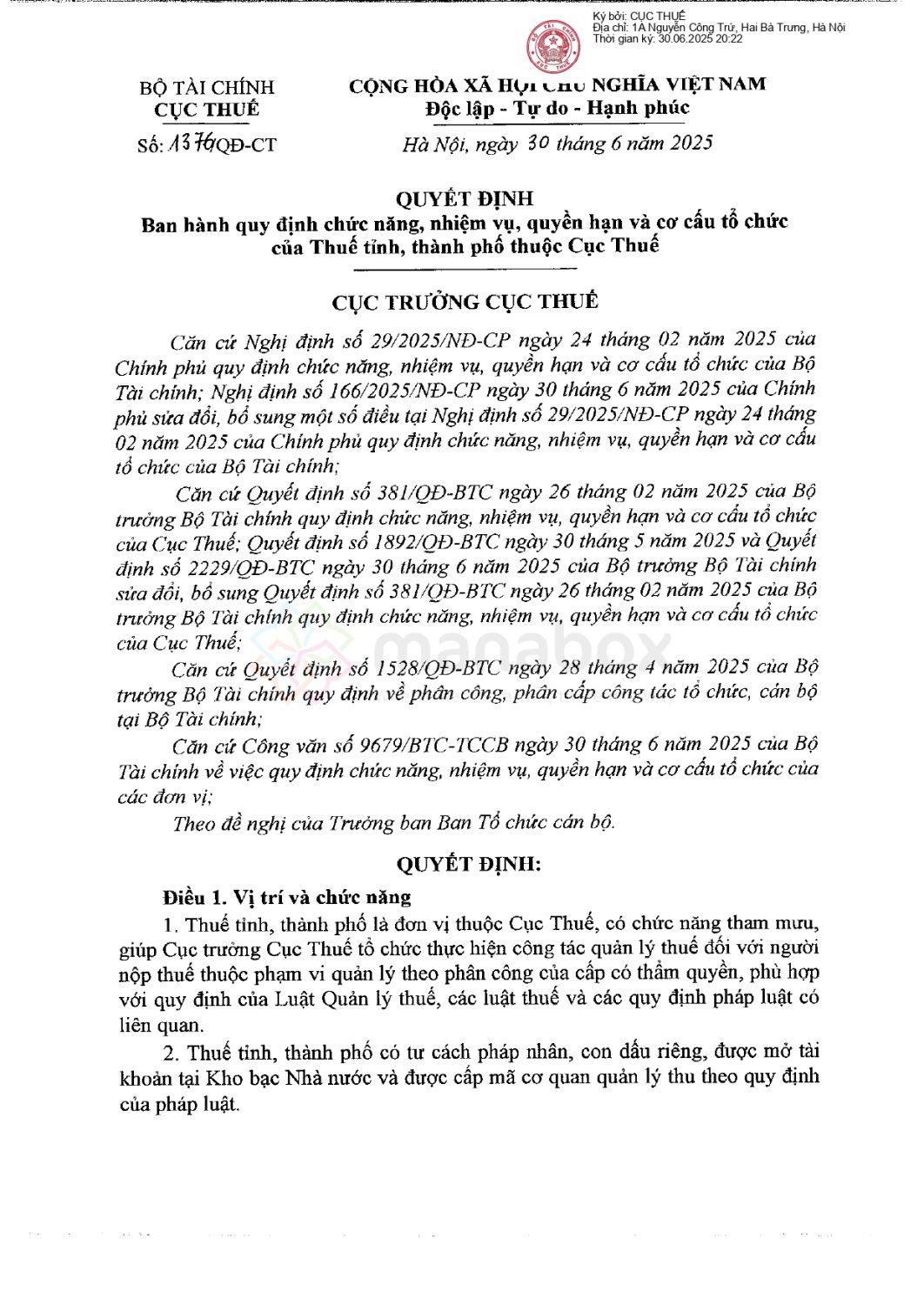 Ngày 30/6/2025, Cục Thuế ban hành Quyết định 1376/QĐ-BTC quy định về chức năng, nhiệm vụ, quyền hạn và cơ cấu tổ chức của Thuế tỉnh thành phố thuộc Cục Thuế, trong đó có danh sách 34 Thuế tỉnh thành phố từ 01/7/2025. Dưới đây là Danh sách 34 Chi cục thuế khu vực mới nhất