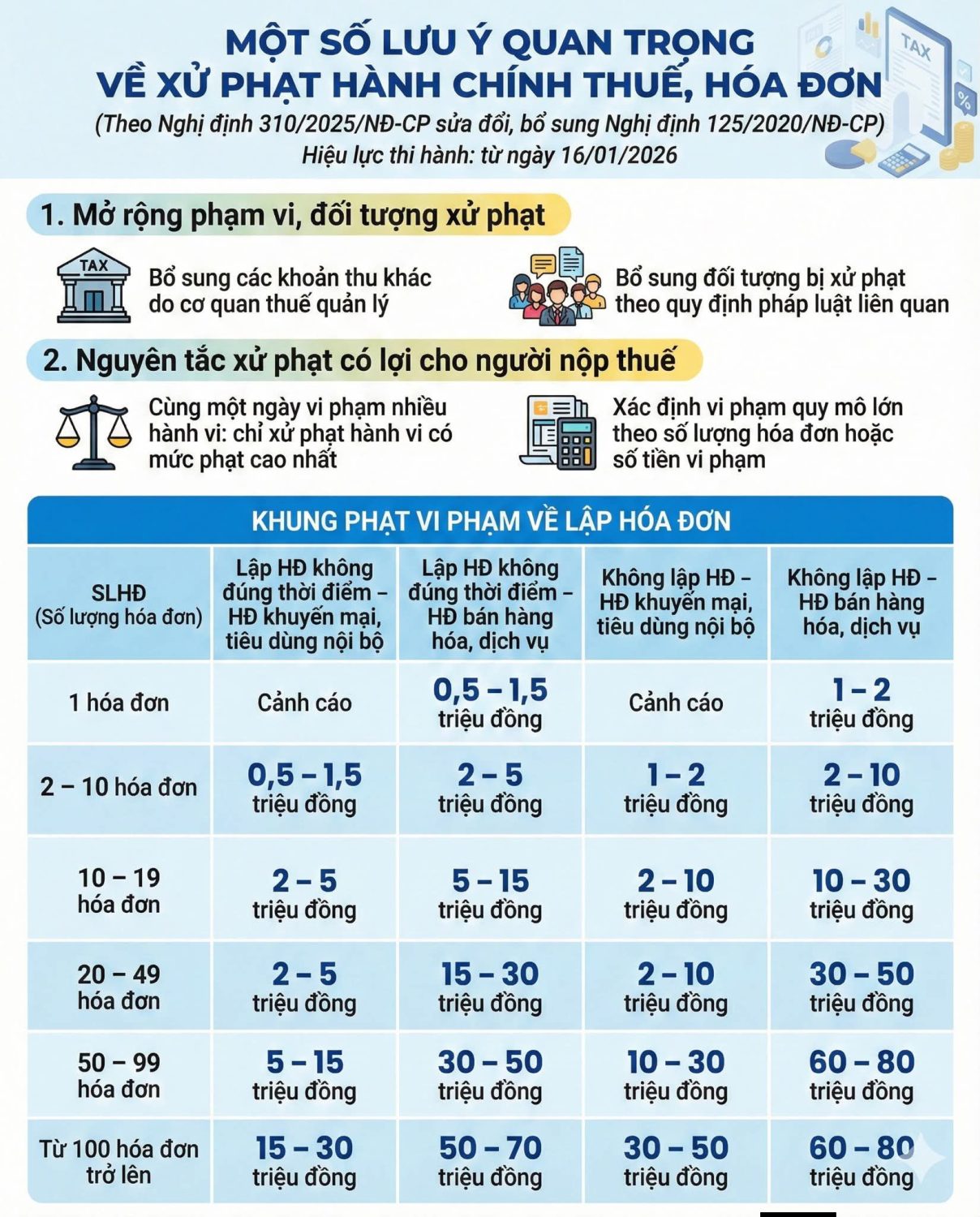 Bài viết tổng hợp các Điểm mới Nghị định 310/2025/NĐ-CP về xử phạt thuế, hóa đơn, trong đó có nhiều thay đổi quan trọng về nguyên tắc xử phạt