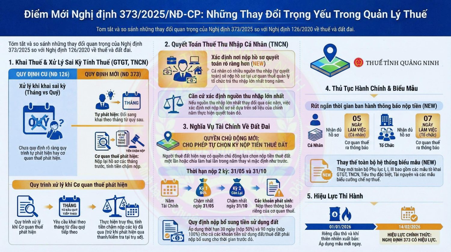 Dưới đây là tổng hợp những điểm mới Nghị định về quản lý thuế số 373/2025/NĐ-CP (sửa đổi Nghị định 126/2020/NĐ-CP). Nghị định này có hiệu lực thi hành từ ngày 14/02/2026, riêng quy định về dầu thô, khí thiên nhiên áp dụng từ 01/01/2026