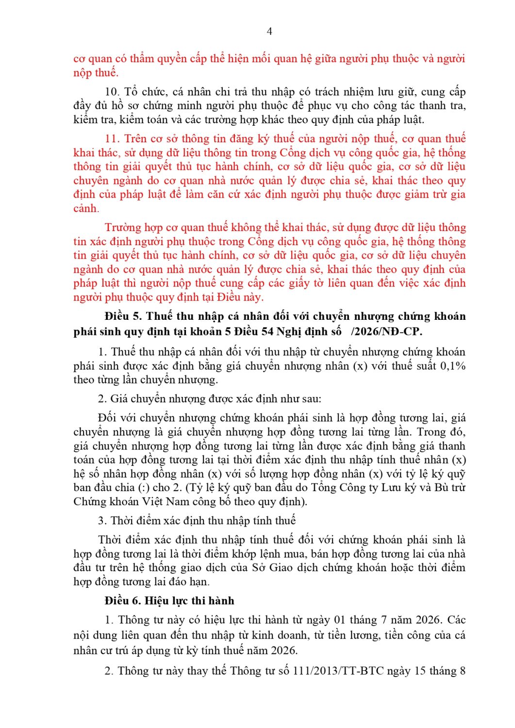 • Khai thác dữ liệu dân cư: Tại Khoản 11 Điều 4, dự thảo nhấn mạnh việc cơ quan thuế sẽ khai thác dữ liệu từ Cổng dịch vụ công quốc gia và Hệ thống thông tin giải quyết thủ tục hành chính. Nếu thông tin đã có trên hệ thống, người nộp thuế không phải nộp bản chụp giấy tờ tương ứng.