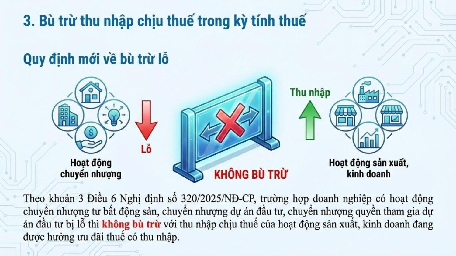 Về xác định thu nhập chịu thuế (Điều 6): Sửa đổi, bổ sung quy định cho phép doanh nghiệp được bù trừ lãi, lỗ từ hoạt động chuyển nhượng bất động sản, chuyển nhượng dự án đầu tư, chuyển nhượng quyền tham gia dự án đầu tư với lãi, lỗ từ hoạt động sản xuất, kinh doanh, trừ hoạt động sản xuất, kinh doanh đang được hưởng ưu đãi thuế.