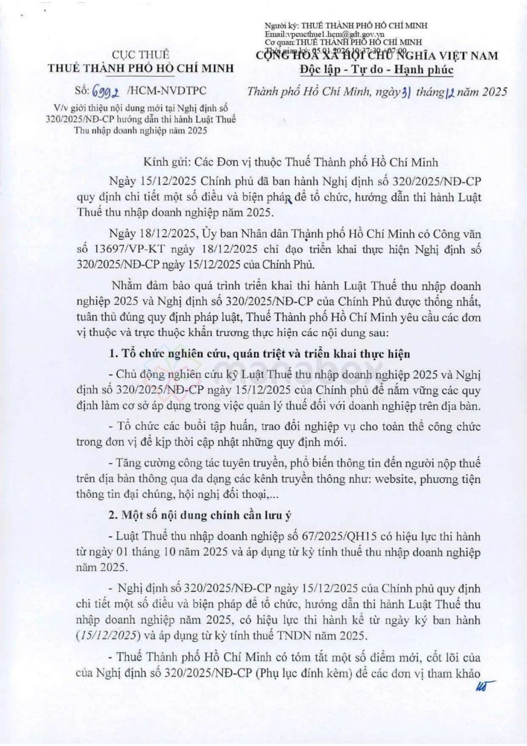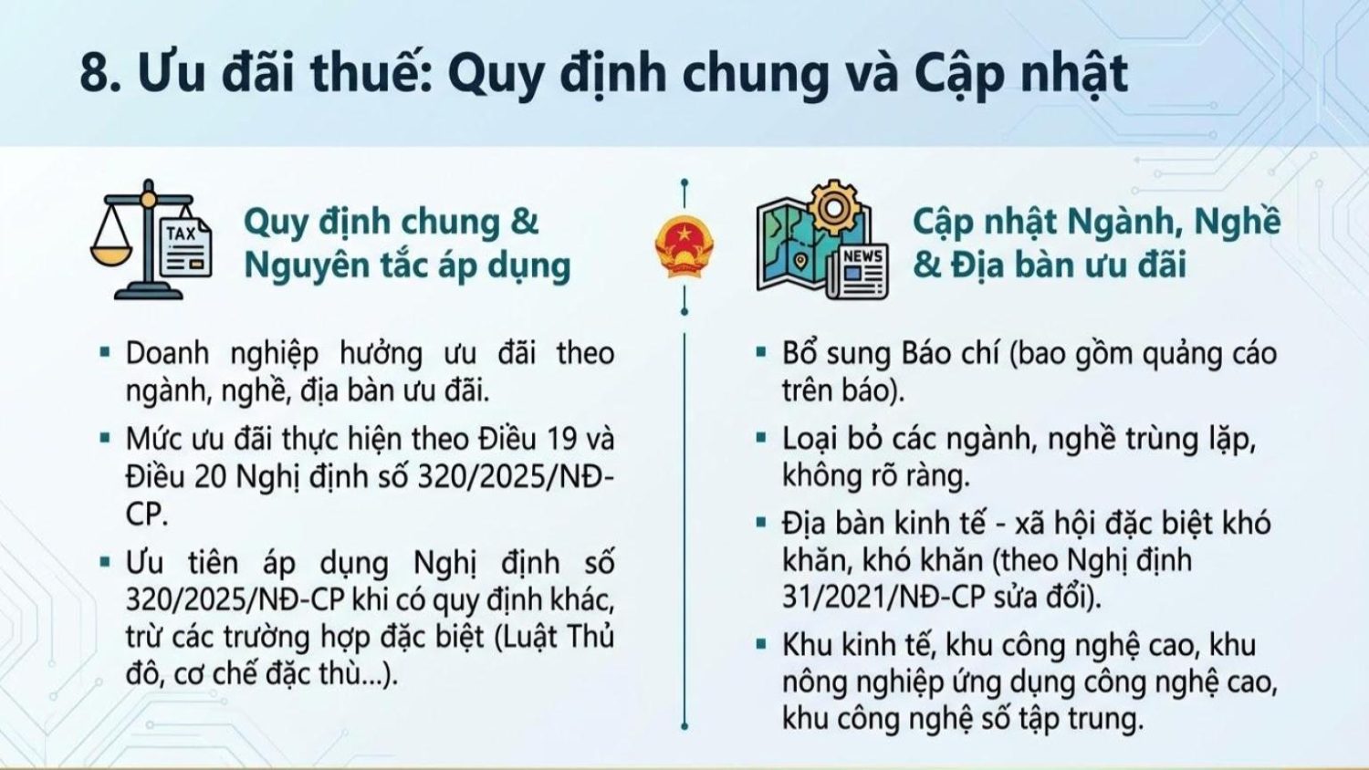 Dưới đây là bảng so sánh chi tiết giữa toàn bộ các nội dung Điểm mới về thuế TNDN theo Nghị định với các quy định tương ứng trong Thông tư hiện nay. Ngày 15/12/2025, Chính phủ đã ban hành Nghị định 320/2025/NĐ-CP quy định chi tiết một số điều và biện pháp để tổ chức, hướng dẫn thi hành Luật Thuế thu nhập doanh nghiệp. Theo đó, người nộp thuế lưu ý một số điểm mới của Nghị định 320/2025/NĐ-CP như sau: