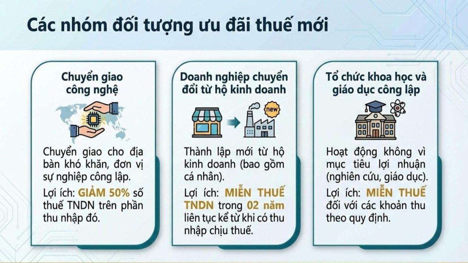 - Đối với các dự dán đầu tư mới: Các dự án đang trong thời gian hưởng ưu đãi (hoặc thuộc diện nhưng chưa được hưởng) sẽ tiếp tục được hưởng ưu đãi cho thời gian còn lại theo quy định cũ; Nếu mức ưu đãi tại Nghị định mới cao hơn, doanh nghiệp được chuyển sang áp dụng mức ưu đãi mới cho thời gian còn lại kể từ kỳ tính thuế năm 2025.