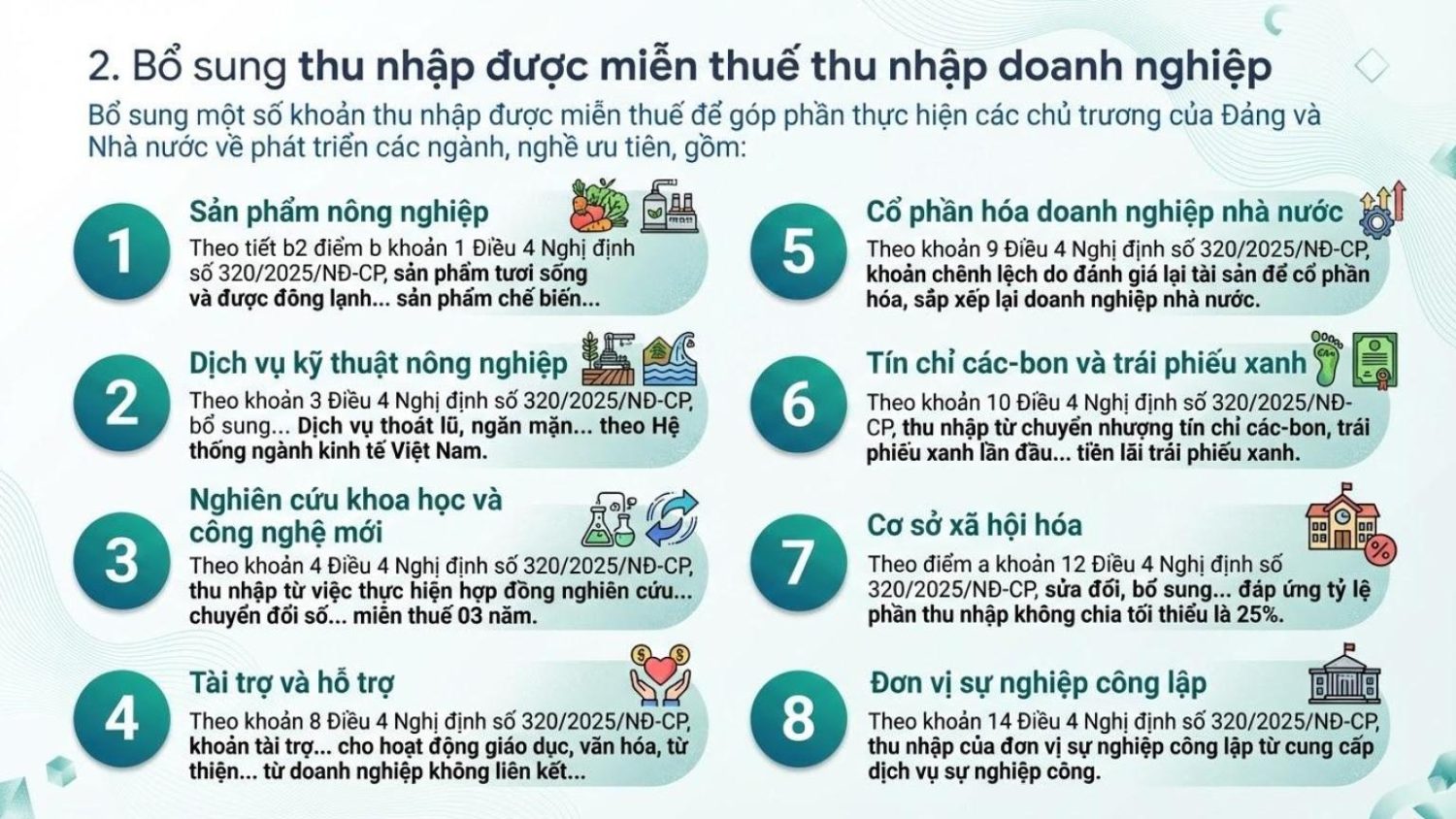 Bổ sung một số khoản thu nhập được miễn thuế để góp phần thực hiện các chủ trương của Đảng và Nhà nước về phát triển các ngành, nghề ưu tiên, gồm: