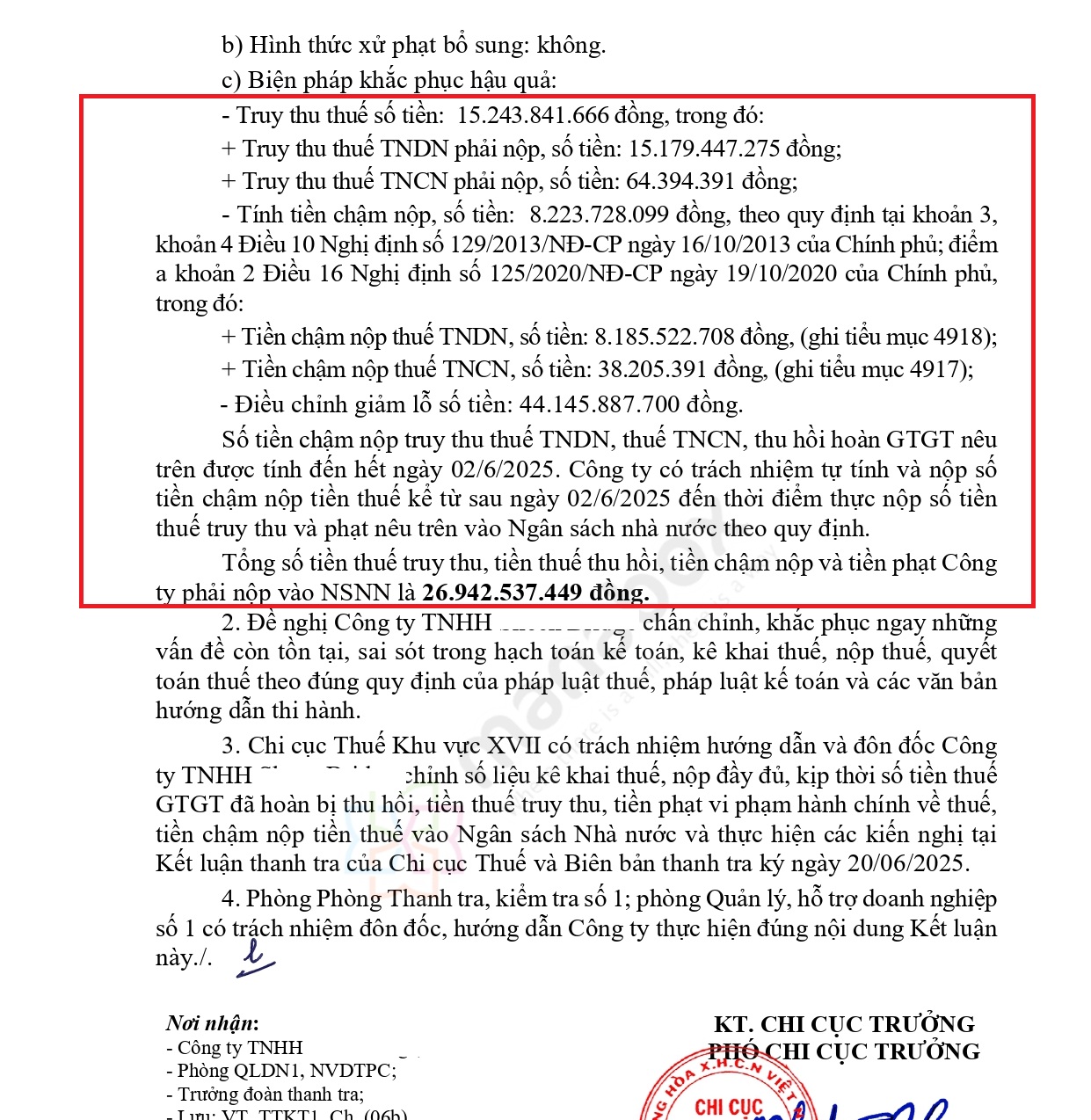 Truy thu và xử phạt: Tổng số tiền bị truy thu và phạt: 26,94 tỷ đồng, bao gồm: