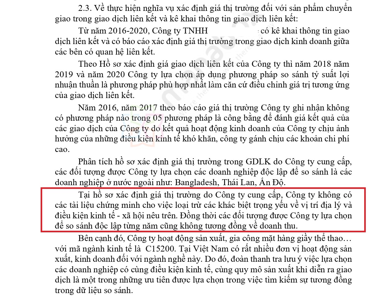 Cơ quan thuế cho rằng việc kê khai lỗ là không hợp lý do không cung cấp đủ bằng chứng để loại trừ các khác biệt trọng yếu (địa lý, thị trường, đặc thù ngành,…) khi so sánh giá thị trường.