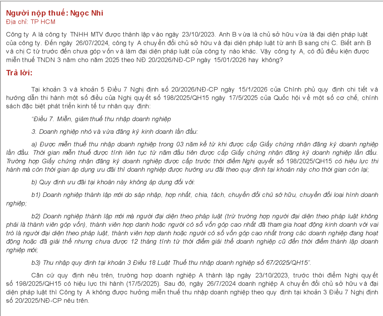 Căn cứ quy định nêu trên, trường hơp doanh nghiệp A thành lập ngày 23/10/2023, trước thời điểm Nghị quyết số 198/2025/QH15 có hiệu lực thi hành (17/5/2025). Sau đó, ngày 26/7/2024 doanh nghiệp A chuyển đổi chủ sở hữu và đại diện pháp luật thì Công ty A không được hưởng miễn thuế thu nhập doanh nghiệp theo quy định tại khoản 3 Điều 7 Nghị định số 20/2025/NĐ-CP nêu trên.