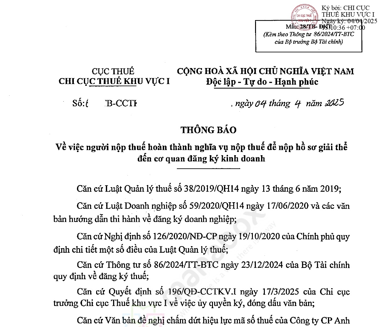 - Thông báo của cơ quan thuế về việc hoàn thành nghĩa vụ thuế